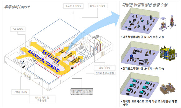 ▲KAI 우주 센터 레이아웃. KAI는 국내 최대 규모로 실용급 위성 6기와 초소형 위성 20기를 동시에 양산할 수 있는 조입장 및 최첨단 우주 환경 시험 설비를 구축해 점진적으로 증대하는 국내외 위성 수요에 대응할 계획이다. (자료=KAI) LIG넥스원도 인공위성 설계제작 기술-인력 교류 및 양성, 연구개발 장비시설 공동 활용, 사업 발굴 등을 추진하고 있다. LIG넥스원 관계자는 40년간 유도무기, 감시정찰, 통신장비, 항공전자전자전 등의 분야에서 쌓은 기술력과 카이스트 R&D 학술인프라가 결합될 경우 차세대 초소형 군집위성 및 SAR 기반기술과 관련해 큰 성과가 기대된다고 밝혔다. LIG넥스원은 2006년 위성 SARDM(개발모델) 개발을 시작으로 현재 실용위성급 SAR 탑재체 개발 완료를 앞두고 있다. 한 업계 관계자는 초소형 SAR 위성 개발은 보다 작고 가벼운 위성을 만드는 방향으로 나아가고 있다며 국내에서도 ADD 산하 첨단기술연구원의 기술개발이 완료되면 국산 기술로 개발된 초소형 SAR 위성체가 글로벌 경쟁력을 갖출 것으로 기대된다고 강조했다.