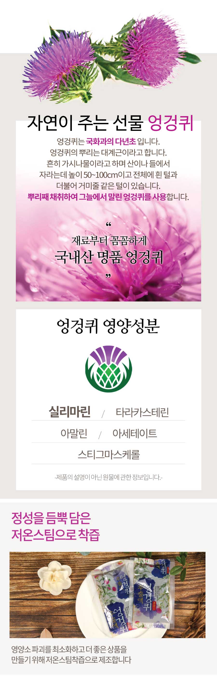 장시간 저온에서 추출하여 영양소를 파괴하고, 원물 그대로 넣은 가시엉겅퀴즙추출물로 흡수율이 높아 편리하게 구하길 선호하시는 분들에게 권합니다.