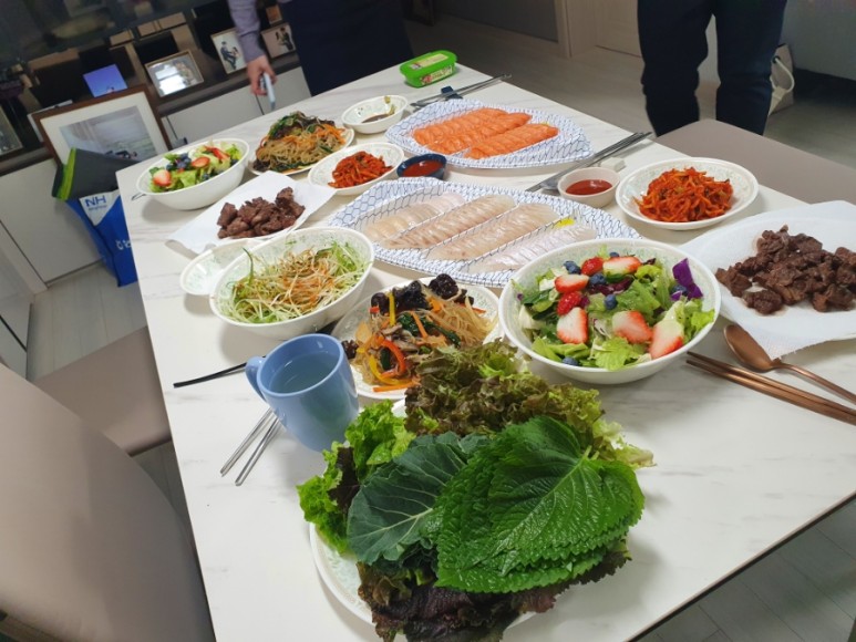 이 웨이드가 직접 해 온 잡채와 반찬, 샤인 청포도, 딸기에 오렌지, 블루베리, 자두까지 ㅜ 내가 과일을 즐겨 먹는다고 했더니 온갖 과일을 다 사왔다.