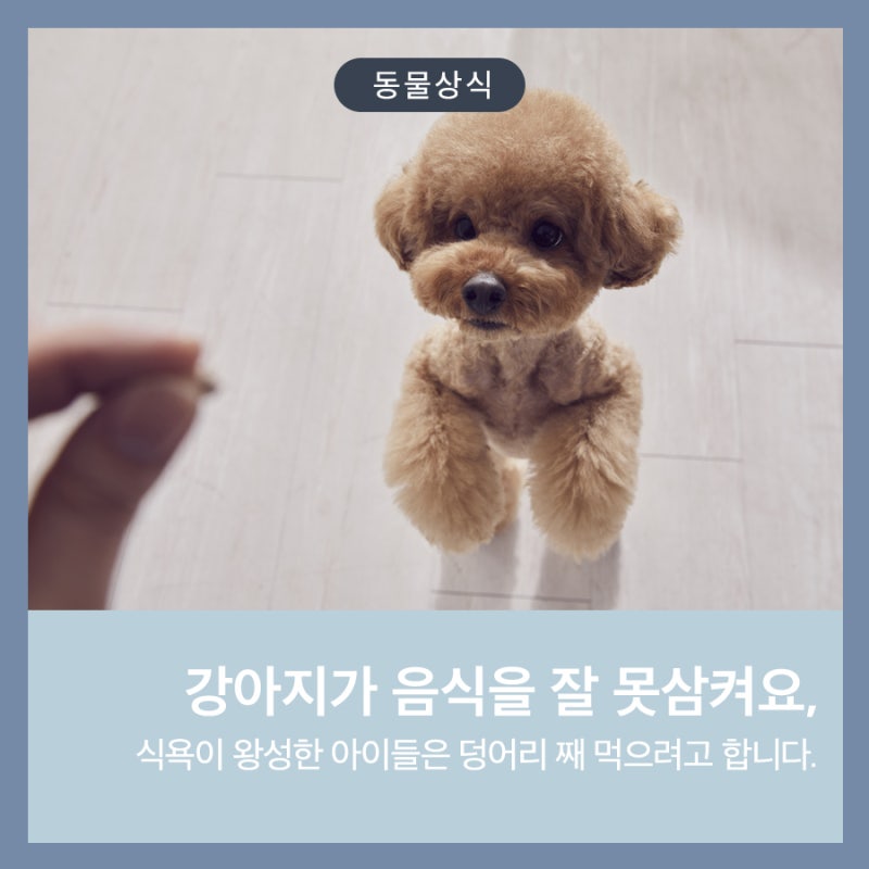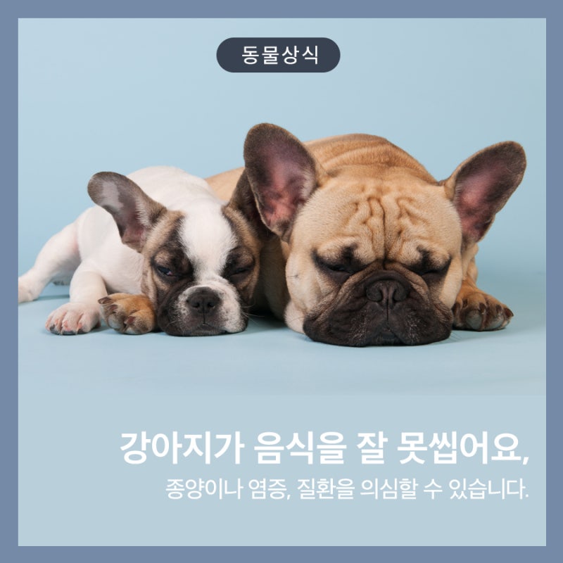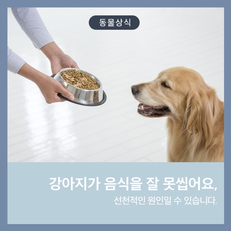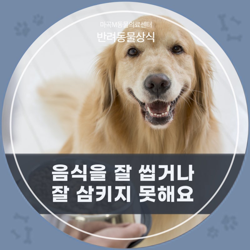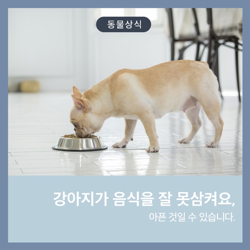 식욕이 왕성해서 씹지 않고 삼키는 것이 아니라 씹는 행동 자체가 힘든 경우 질환으로 인한 통증 때문일 수 있습니다.강아지가 선천적으로 상악골과 하악골의 위치가 다르고 부정교합이 있는 경우 음식을 잘 씹지 못할 수 있습니다. 일상생활에 문제가 없다면 괜찮지만 부정교합 때문에 음식을 제대로 먹지 못해 영양실조로 이어진다면 수술이 필요합니다.강아지가 음식을 잘 씹지 못해 잇몸이 붉어지고 입냄새가 나는 경우 잇몸 또는 치아 문제를 의심해 볼 수 있습니다. 치주염, 구강종양 등으로 인해 잇몸에 염증이 생기고 치아가 썩기 시작하면 통증으로 음식을 씹을 수 없게 됩니다. 반려동물에게 음식을 잘 씹지 못하는 증상이 나타났을 때는 이미 통증이 심한 상태가 될 수 있으므로 빠른 시일 내에 동물병원을 찾는 것이 좋습니다.특히 구강종양의 경우 종양의 종류에 따라 다르지만 일반적으로 악성 일활률이 높기 때문에 신속하게 정밀검진을 받아야 합니다.이외에도 턱관절이 좋지 않거나 씹는 근육에 문제가 있으면 음식을 잘 씹지 못할 수 있습니다.