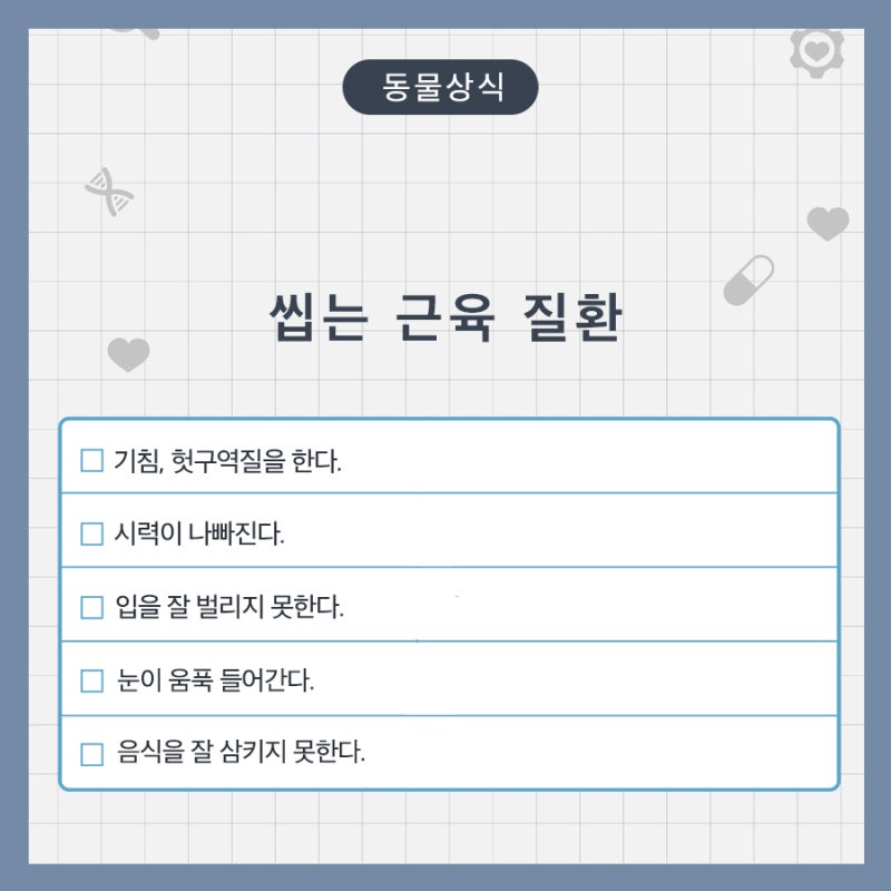구강 질화기침을 하는 머리를 한쪽으로 기울여 씹는 뒤 음식을 삼킬 때 과도하게 머리를 뒤로 젖히기, 입으로 음식을 씹고 뱉는 행동을 반복하기, 침을 많이 흘린다.식도질환 음식을 목에 건넸다가 다시 토해낸 뒤 음식을 잘 삼키지 못하면 침을 많이 흘린다.구역질나는 씹는 근육질환 기침을 하는 시력이 나빠지는 입을 잘 벌리지 못하는 눈이 움푹 패인 음식을 잘 씹지 못한다.