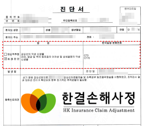 보험증권, 진단서, 수술후 병리검사 결과지를 준비하여 손해사정사와 함께 검토하여 분쟁을 진행하면 분쟁에 휘말리지 않고 좋은 결과로 끝나는 사례도 있으니 서류를 준비하여 함께 검토하시기 바랍니다.
