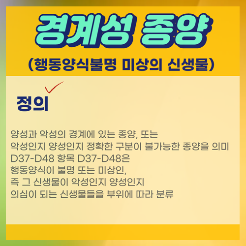 한국 표준질병사 분류상 D37~D48 “행동양식 불명 신생물”로 분류되어 있습니다!