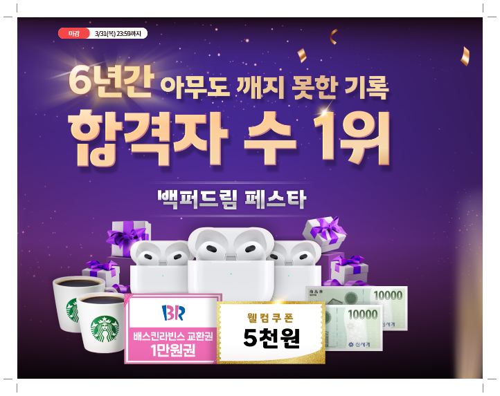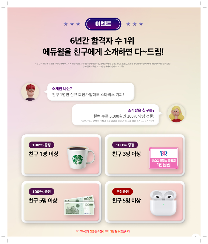 현재 에듀윌에서는 6년 동안 합격자 수 1위를 아무도 깨지 못한 기록을 달성하고 있습니다이것을 기념하여 에듀윌 공식 페이지에서 특별 이벤트를 실시하고 있다고 합니다.친구를 소개해서 친구가 회원가입을 하면 경품을 증정하는 이벤트라고 하네요.친구 1명 이상이면 스타벅스 커피를 친구 3명 이상이면 베스킨라빈스 교환권 1만원, 친구 5명 이상이면 신세계 상품권 2만원 전원 증정 한대요! 더해서 친구 5명 이상이면 추첨을 통해 에어팟 3세대를 받을 수 있다고 합니다.3월 31일에 행사가 종료될 예정이니 좋은 기회 놓치시지 마시고 많은 참여 바랍니다.등록한 친구 수에 따라 경품 전원/추첨으로 증정하며, 품절시 조기 마감될 수 있음을 참고해주세요!