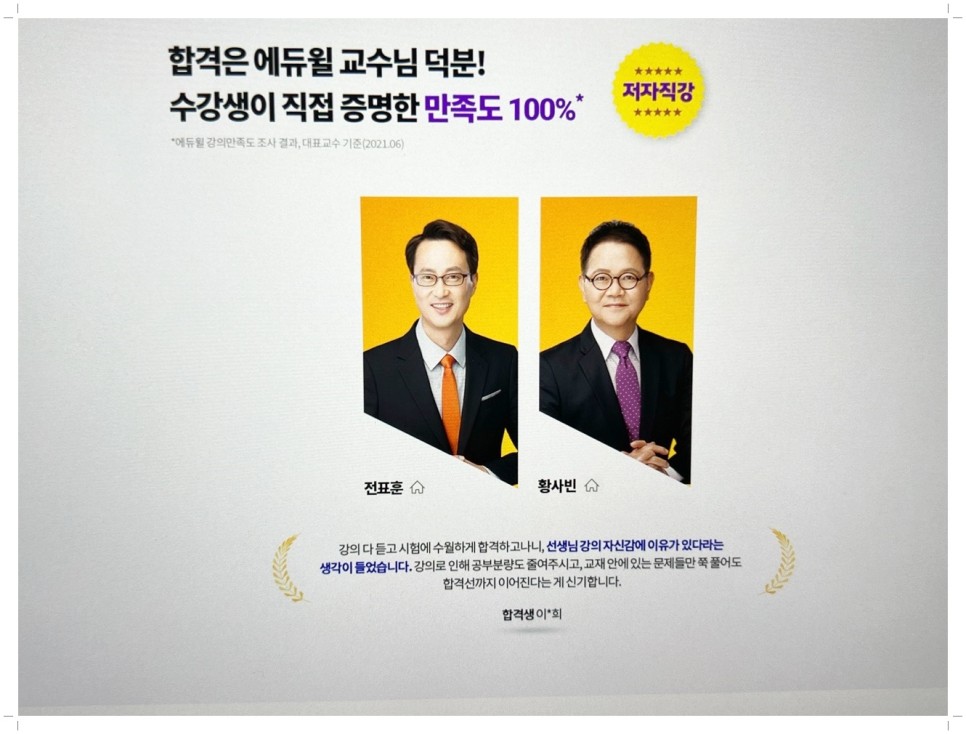 제가 선택한 곳은 에듀윌이었는데, 타사 대비 압도적인 합격자 수를 자랑했고, 체계적인 커리큘럼을 제시했기에 이곳을 선택하게 되었습니다.강의를수강하다보니확실히전문가와함께공부할수있었기때문에쉽게학습할수있었습니다.저처럼 기초가 전혀 없는 초보 수험생이라도 빨리 합격할 수 있도록 실력을 완성시켜 주셔서 정말 만족했습니다.