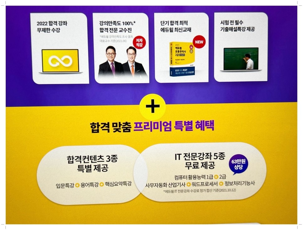 수업은 과목별 전문강사님 두 분이서 진행을 하셨고요.처음엔 독학으로 준비를 할까도 생각했지만 혼자 하기엔 기초가 전혀 없었기 때문에 도중에 포기하지 않을까 걱정이었습니다.그래서 인강을 알아보니 가격도 저렴하고 다양한 시험자료도 제공되어 효율적인 학습을 할 수 있을 것이라 생각했습니다.저같은경우에는준비기간이3개월정도로여유를갖고있는편이아니었기때문에전문가들의도움이간절히필요했습니다.강의는 장소에 대한 제약 없이 언제 어디서나 들을 수 있고 단기 합격을 목표로 하는 분들도 틈틈이 많기 때문에 많은 도움이 될 겁니다.