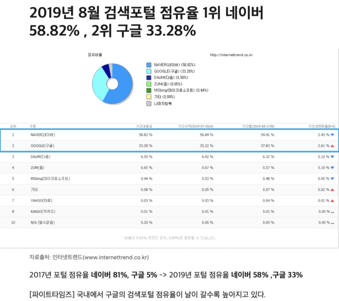 한국은 구글이 점유율 1위를 차지하지 못한 몇 안 되는 나라 중 하나입니다. 바로 네이버라는 막강한 포털사이트가 존재하기 때문입니다. 하지만 몇 년 전부터 유튜브 인기와 크롬을 통한 모바일 사용량이 증가하면서 한때 점유율 순위가 바뀐 적이 있을 정도로 구글의 상승세가 두렵습니다.