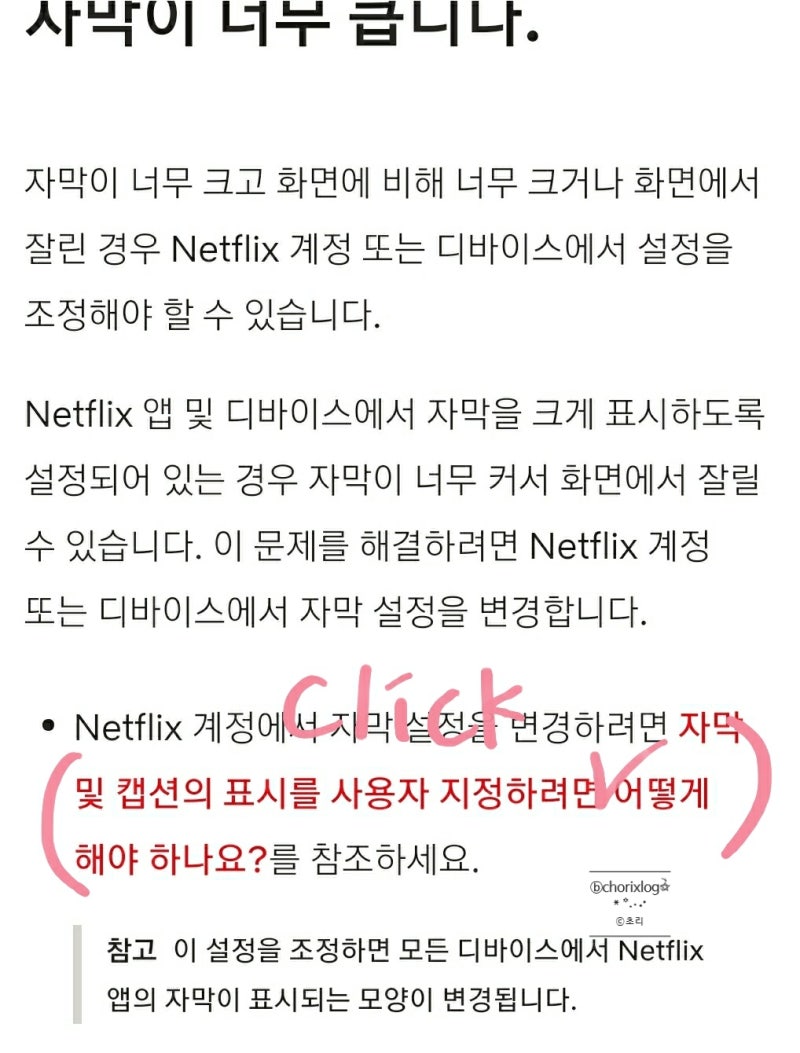 자주 많은 분들이 아시는 방법은 넷플릭스에 들어가서 보고 싶은 영화나 드라마를 고른 후 하단 부분에 음성이나 자막 메뉴가 있기 때문에 여기서 변경할 수 있을 거라고 생각했던 것 같습니다. 여기서는 음성 국가 언어와 자막 국가 언어만 변경이 가능합니다. 따라서 자막의 위치, 자막의 크기, 종류를 변경하고자 하는 분은 위 링크에서 변경할 수 있습니다.