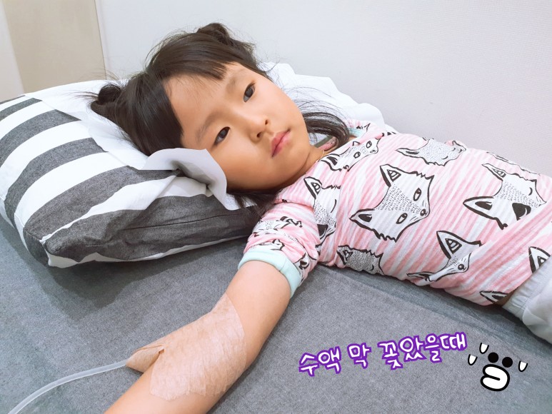 소아과로 직행했는데 편도선이 부어 장염일 것 같아 약 처방만 받고 집에 왔다.다음날까지 집에서 계속 토했고 밤새 아이가 힘들어했다.아침부터 곧바로 다시 병원을 찾았다.독감 검사를 했더니 아니란다.노로 바이러스와 같다고 해서 마실 수 없기 때문에 해열주와 수액을 두는 것.