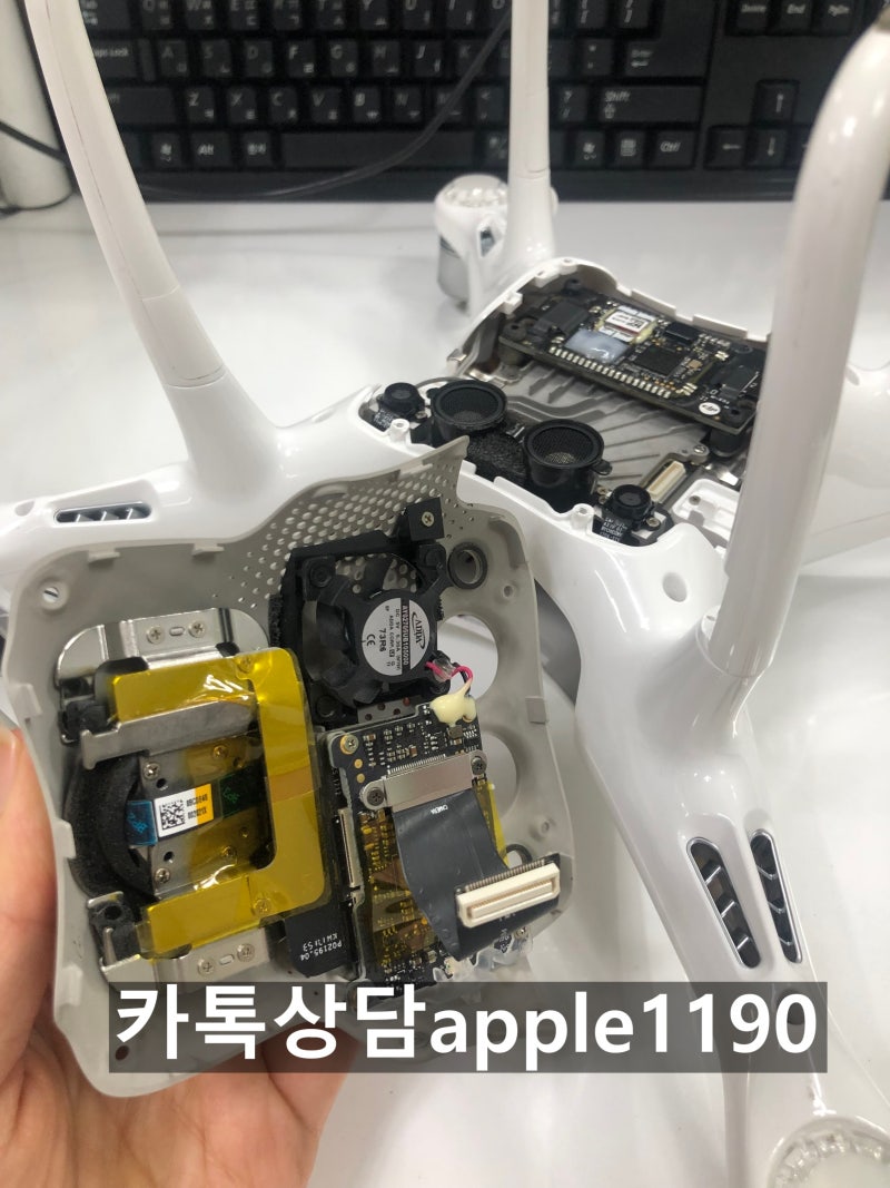 특히 팬텀4 드론 수리가 많았는데요.팬텀4 드론이 출시된 지 몇 년이 돼서 요즘 수리 건수가 많은 것 같아요.또한 마빅 2 시리즈도 출시된 시기가 있어서 수리가 많이 들어오고 있거든요.오늘 입고된 팬텀4 옵시디언 기체는 짐벌 파손과 바디쉘 파손이 심각한 상태였습니다.