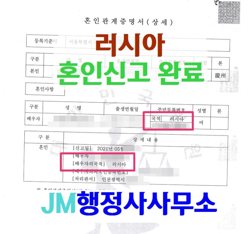 결혼비자를 신청하기 위해서는 먼저 혼인신고를 하고 대한민국 국민의 배우자로서의 조건을 갖추어야 합니다.러시아에서 미혼증명서를 발급받아 한국에서 혼인신고를 해야 합니다. 미혼증명서는 결혼하지 않은 상태임을 증명하는 서류로 미혼증명서, 출생증명서, 여권 원본을 지참하고 필요한 서류와 함께 한국 구청에 방문하여 혼인신고를 제출해야 합니다.러시아국제결혼체류자격변경허가2014년 4월 1일부터 결혼이민 비자 심사기준이 종전보다 강화됨에 따라 혼인신고를 하더라도 결혼비자가 허가되지 않을 수 있습니다. 결혼비자에 필요한 서류와 충족요건을 확인하고 꼼꼼하게 서류를 준비해야 결혼비자 허가를 받을 수 있습니다.러시아국제결혼체류자격변경허가한국인 배우자의 소득 입증은 중요한 요건 중 하나입니다.부부 사이에 태어난 자녀가 있거나 임신 후 20주가 지난 경우 또는 부부가 1년 이상 외국에서 동거하고 과거 1년간 국내소득이 없는 경우 소득요건이 면제될 수 있습니다.러시아국제결혼체류자격변경허가근로소득을 활용하는 경우, 사업소득을 활용하는 경우, 기타소득을 활용하는 경우에 따라 준비해야 하는 서류가 다르기 때문에 본인의 상황과 사정에 맞는 서류를 잘 준비해서 제출해야 합니다. 또한 소득 기준을 체크하고 그에 맞는 금액을 증명해야 합니다.안정적인 주거환경을 갖추고 있는지 신용상태 등 서류를 준비해야 하며 교제입증서류를 통해 두 분 혼인의 진정성을 심사담당자에게 충분히 전달할 수 있어야 합니다.러시아국제결혼체류자격변경허가외국인 배우자는 두 분의 원활한 의사소통이 가능한지 확인하는 언어요건을 마련해야 합니다.한국어로 입증할 경우 세종학당 이수 또는 지정된 교육기관 이수 또는 한국어능력시험(TOPIK) 1급 이상 취득증을 제출해야 합니다.러시아국제결혼체류자격변경허가JM 행정사 사무소는 더 많은 고객의 결혼 비자 허가를 위해 노력합니다.결혼 비자는 쉬운 일이 아닙니다. 서류를 꼼꼼히 준비하지 못해 서류가 누락되거나 미흡할 경우 심사 기간이 오래 걸리거나 불허 처분을 받을 수 있습니다.체류자격 변경으로 러시아 결혼비자 허가를 진심으로 축하드립니다.러시아국제결혼체류자격변경허가앞으로도 더 많은 분들의 결혼비자 허가를 위해 노력하는 JM 행정사 사무실이 되겠습니다.저희 사무소는 여러 나라와 다양한 상황에서 결혼비자 허가에 대한 많은 사례를 보유하고 있으며, 이를 바탕으로 JM 노하우를 가지고 결혼비자 준비를 돕고 있습니다.저희 쪽에 수임해주시면 1:1 담당자 배정되어 서류 준비부터 사후 관리까지 꼼꼼히 도와드리겠습니다.신뢰할 수 있는 JM 행정사 사무실과 함께 결혼 비자를 준비하고 신속하고 정확한 서류 준비를 해보세요.감사합니다。러시아국제결혼체류자격변경허가러시아국제결혼체류자격변경허가러시아국제결혼체류자격변경허가JM행정사사무소 서울특별시 종로구 종로19JM행정사사무소 서울특별시 종로구 종로19JM행정사사무소 서울특별시 종로구 종로19