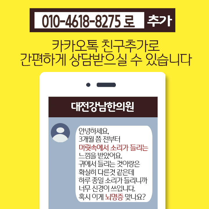 - 뇌명증 치료와 관련하여 더 궁금하신 점이 있으시면 카카오톡으로 질문 보내주시기 바랍니다.