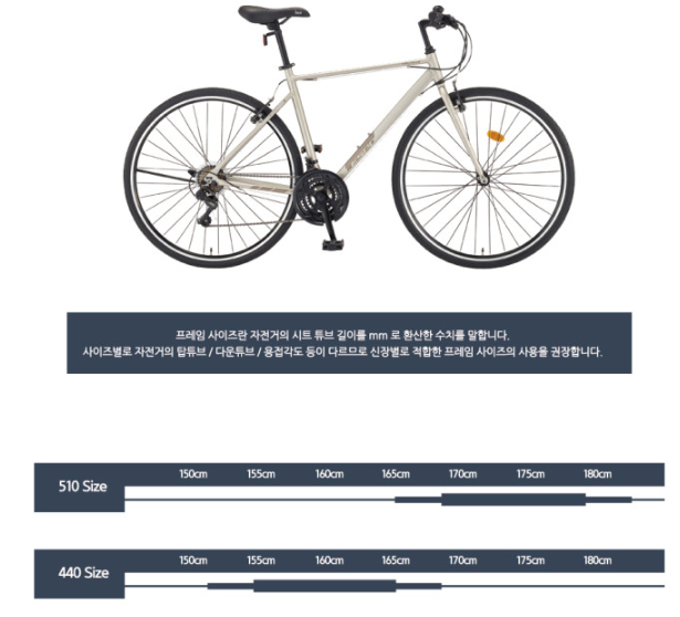 사이즈 기준은 위 사진과 같아요! 신장 165~180까지는 510사이즈, 150~170까지는 440사이즈를 추천했어요!165cm인 저는 440,175cm인 시루아빠는 510사이즈를 선택했어요! 제 키에 맞는 프레임 사이즈를 선택해야 안전하고 즐겁게 탈 수 있어요. ㅎㅎ