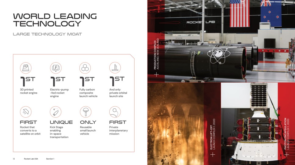 3D프린터를 활용한 로케트 엔진 제작기술 1위 전기펌프 로켓 엔진기술 1위 완전 복합탄소로켓 발사체기술 1위 개인궤도 로켓 발사사이트 보유 1위 궤도내 위성배달 로켓 최초 개발 유일 재상용 가능한 소형 로켓 발사체 보유 행성간 임무 첫 수행