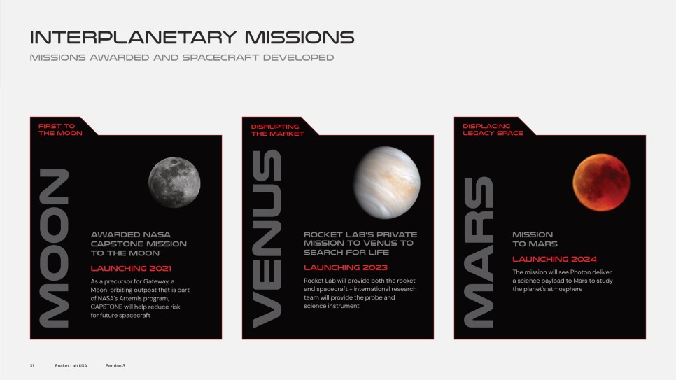 위에서 말씀드린 NEUTRON의 개발이 끝나 상용화되면 Rocket Lab은 2021년 달 탐사, 203년 목성 탐사, 2024년 화성 탐사를 계획하고 있습니다.