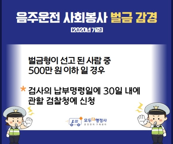 음주운전 사회봉사제도를 알고 있나요? 음주운전으로 적발되면 면허정지 또는 취소와 함께 벌금이 부과됩니다.