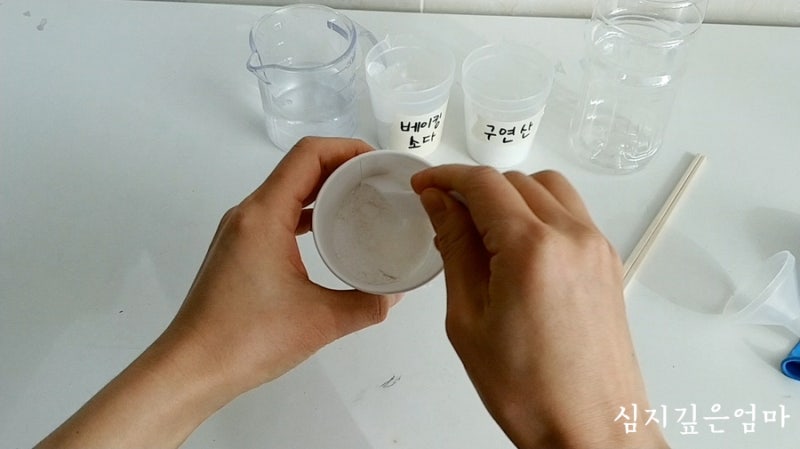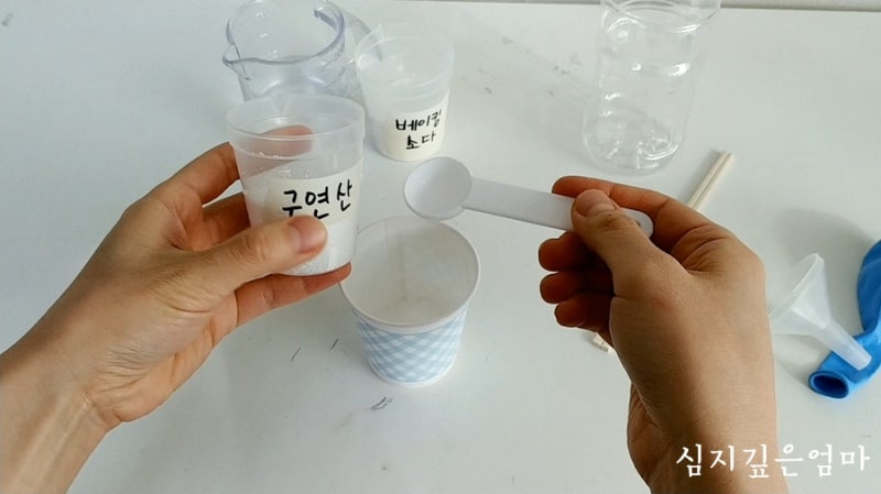 종이컵에 베이킹 소다와 구연산을 1:1 비율로 넣습니다.~계량스푼을 이용하시면 됩니다~ 저는 숟가락 2스푼씩 넣었습니다.