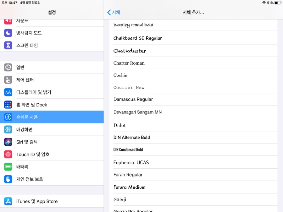 다운로드 받은 글꼴로 변경하려면 서체로 들어가 서체 추가를 클릭하십시오.그런 다음 자신이 다운로드 받은 글꼴을 찾아서 눌러 주시면 됩니다.