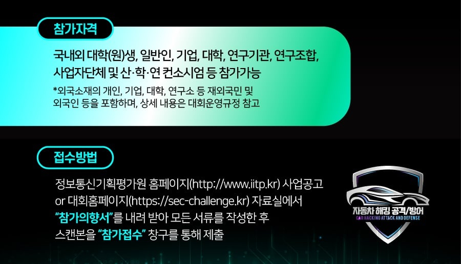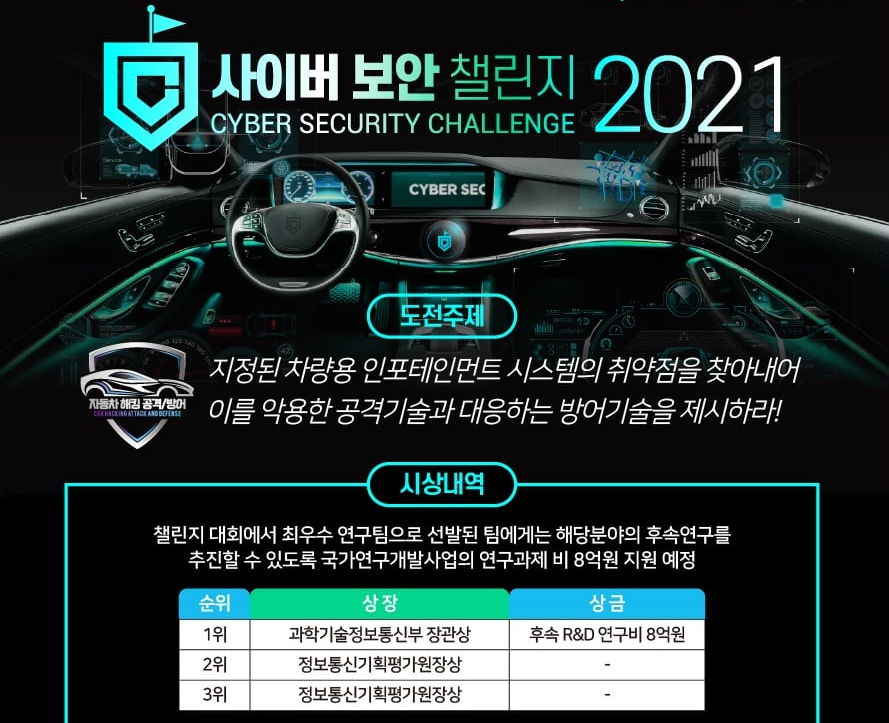 해외와 같이 국내에서도 자율주행 자동차에 ICT 기반기술의 영역이 확대됨으로써 보안의 중요성을 인식하고 보안기술 확보에 힘쓰고 있습니다. 특히 지난해에는 ‘차량 내 네트워크 보안’을 주제로 경진대회를 열었으며, 2021년 현재는 과학기술정보통신부가 ‘자율주행 자동차 보안기술’을 주제로 한 2021년도 사이버 보안 챌린지대회를 주최하고 있습니다. 특히 본 사이버보안 챌린지대회는 9월 15일 수요일까지이므로 관심있는 분들은 참여하시기를 권장합니다.