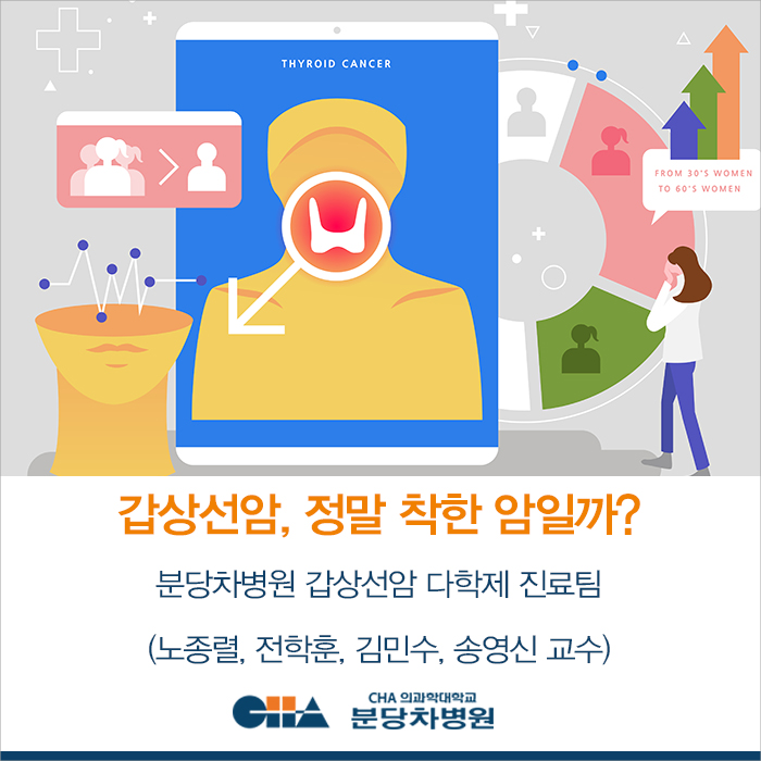 여성 암 2위를 차지하는 갑상샘암오늘은 갑상선암에 대해서 분당차병원 갑상선암 다학제 진료팀 이비인후과 두경부외과 노종렬, 외과 정학훈, 내분비내과 송영신 교수님이 알려드립니다.30대에서 50대, 젊은 사람에게 많이 발생하는 갑상선암은 남성에게서 남성의 4~5배 정도의 빈도가 높습니다.남성 쪽이 발병은 적지만 여성에 비해 다소 불량 예후가 보이는 것으로 알려져 있어 보다 주의가 필요합니다.