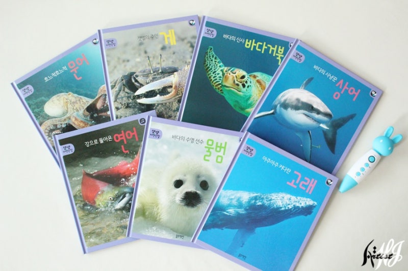 안녕하세요. 온엘 엄마입니다.17개월 된 엘은 최근 부쩍 동물에 관심이 많아졌어요.산책 중 만나는 강아지와 고양이를 보면서 목소리를 따라하거나 TV에 나오는 동물들을 보면서 잠시 집중하면서 봅니다.그런 엘을 위해 물에 사는 동물에 대해 자세히 알려주기 위해 블루래빗의 생생한 자연관찰을 토끼펜을 활용해 소리를 들으며 읽어봤습니다.