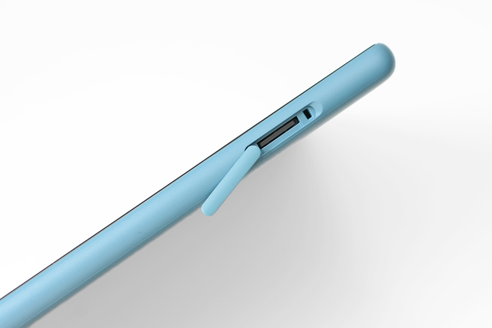 상부에 볼륨 버튼, U SB C타입 충전 단자, 이어폰 단자, 전원 버튼이 있으며 왼쪽면에 스피커가 있습니다.이 제품은 백 커버 색상이 플럼, 블랙, 화이트, 트와일라잇 블루의 4 종류입니다. 트와일라잇 블루는 채도가 낮은 블루 컬러이기 때문에 딱 제 취향입니다.