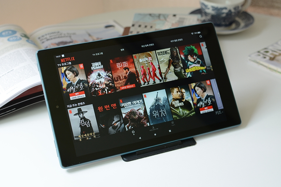 넷플릭스 타블렛으로 쓰기에는 딱 좋아요 화면이 적당히 크고 스피커 볼륨도 충분해요. 한국 계정으로 로그인 하기 때문에 한글 자막도 문제없이 나오니까요.
