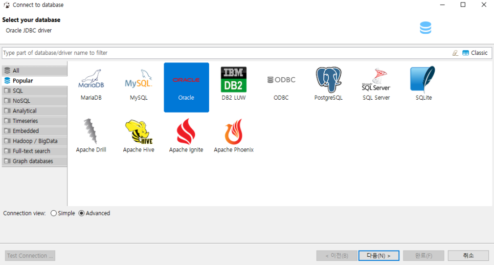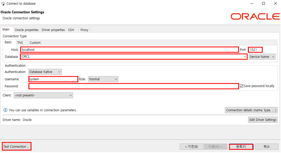 3. 데이터베이스의 정보를 입력하고 Test Connection.. 버튼을 클릭하여 테스트 후 완료(F) Test Connection 버튼을 클릭하면 해당 데이터베이스에 연결하기 위한 커넥션 등 설치 파일이 필요한 경우 알림창이 뜨지만 Download를 눌러 연결하기 위한 설치 파일을 설치한 후 다시 Connection합니다.Host:사용하는 데이터베이스가 저장되어 있는 IP Port:사용하는 데이터베이스의 Port(기본 1521) Database:데이터베이스 이름(기본 ORCL) Username:데이터베이스 계정 이름 Password:데이터베이스 비밀번호 Test Connection. .:위의 정보를 입력하여 연결되어 있는지 테스트 완료(F): 연결되며 Database Navigator에 연결된 데이터베이스 표시