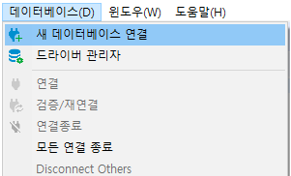 데이터베이스 연결의 1. 데이터베이스를 연결하기 위해 아래 둘 중 하나를 수행합니다.1-1. Database Navigator 메뉴에서 오른쪽 클릭 – Create – Connection 1-2. 상단 메뉴 데이터베이스 – 새로운 데이터베이스 연결