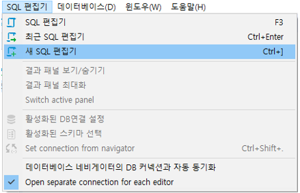 SQL 에디터 열기 1. 상단 메뉴 SQL 에디터 – 새로운 SQL 에디터 클릭 2. 단축키 이용(Ctrl + ])