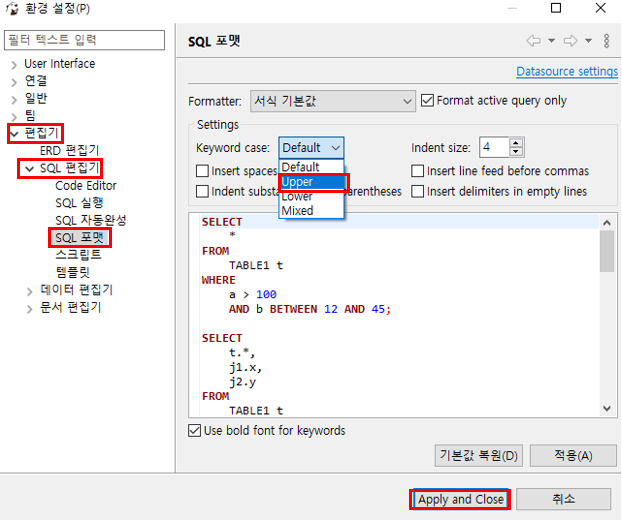 2. 에디터 – SQL 에디터 – SQL 포맷 Keyword case – Upper : SQL 키워드를 대문자로 변경