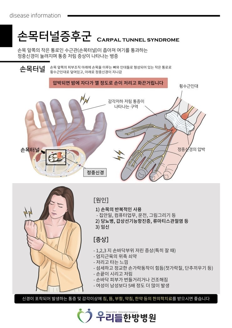 왜 손이 저리고 힘이 안 들어가지?갑자기 우리 몸에 발생할 수 있는 여러 증상들은 그 정도에 따라 쉽게 생각할 수도 있고 때로는 심각한 내용이라는 이전의 걱정을 하게 마련입니다. 평소와 다른 몸 상태는 당연히 우리 몸이 알려주는 이상 신호와 같기 때문에 단순한 내용이라도 쉽게 생각할 필요가 없습니다. 그래서 오늘은 손목터널증후군에 대해서 이상윤 원장님을 통해서 알아보도록 하겠습니다.