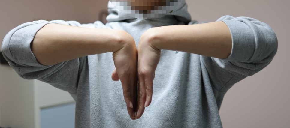손목 바깥쪽을 푸는 주먹을 쥔 상태에서 손등을 위로 향하게 하여 주먹을 안쪽으로 가볍게 내립니다.손등을 구부리는 동작으로, 이 또한 팔꿈치는 편 상태로 진행이 됩니다. 5~10초 동안 동작을 유지해 줍니다.