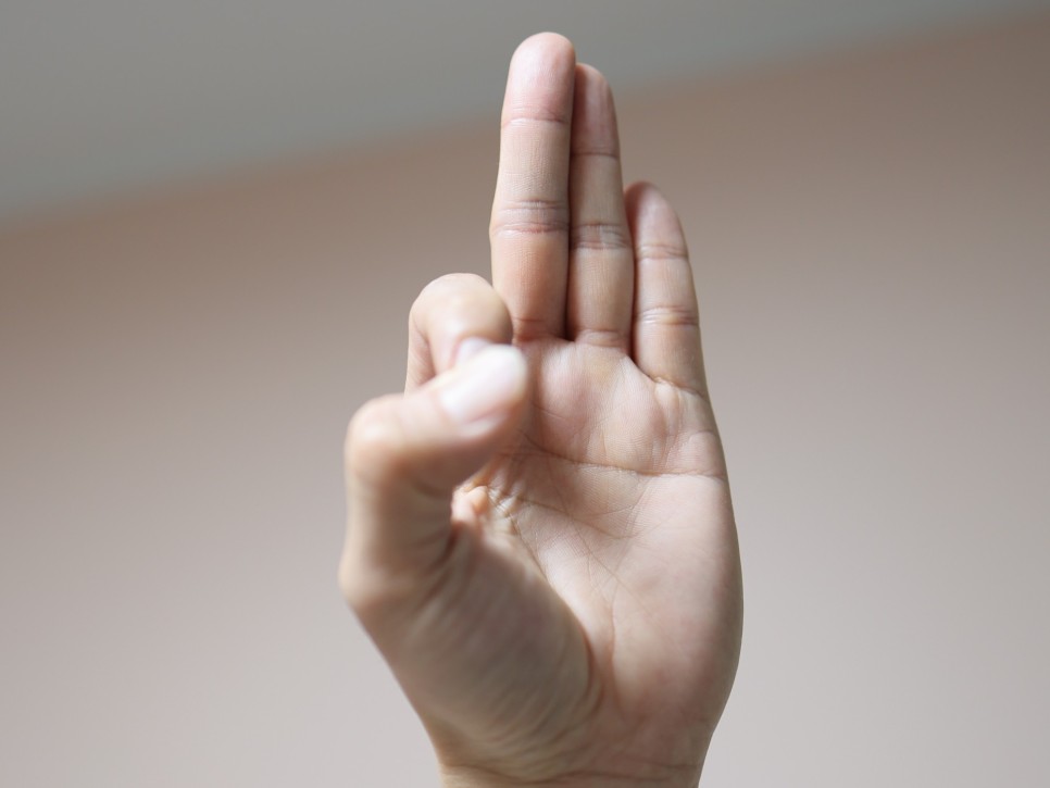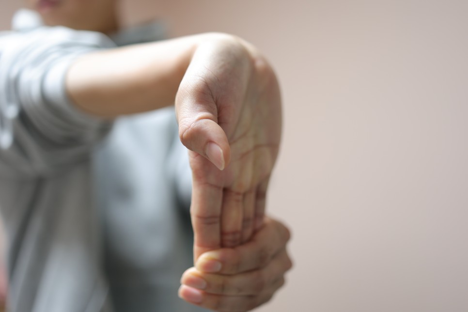 4) 엄지손가락을 들어올리는 손의 등을 편 상태에서 검지부터 약지까지 손가락을 붙이고 엄지손가락만 따로 떼어 반대손가락으로 힘을 주어 내립니다. 손목은 조금 손등 쪽으로 젖혀야 하고 팔꿈치는 직각이 됩니다. 5~10초간 유지합니다
