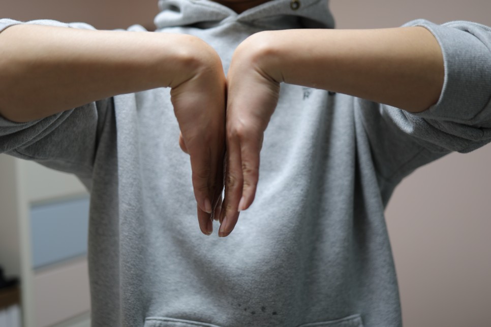 2) 손목 안쪽을 풀어주는 손의 손바닥이 보이도록 하여 반대 손으로 손바닥과 손목이 직각이 되도록 잡아당기는데, 이때 팔꿈치는 완전히 편 상태여야 하며 손목이 아플 경우 완전한 직각을 추구하지 않아도 됩니다. 이 동작 후에는 약 5~10초간 정지하고 자세를 유지합니다