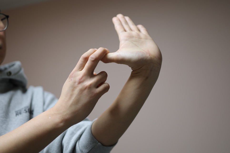 2) 티넬 검사 엄지와 검지를 붙이고 안쪽으로 약간 구부렸을 때 손목에 나오는 해당 부위를 손으로 꾹꾹 누르거나 툭툭 만졌을 때 쿡, 통증, 저림이 발생하는지 확인