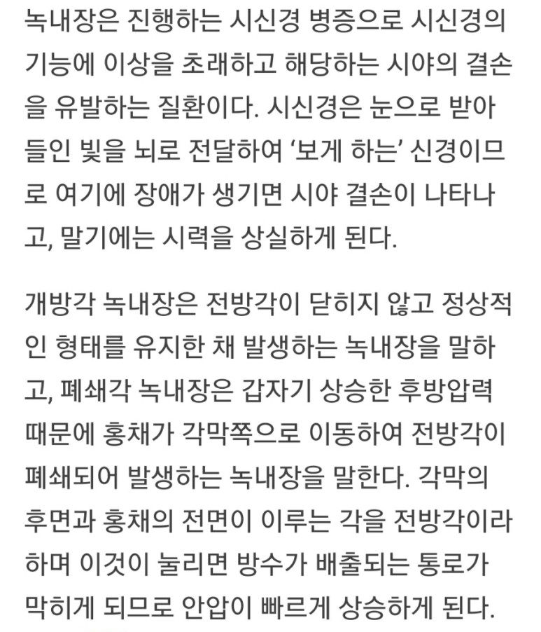 오늘은 실명을 부르는 눈 질환, 두 번째 녹내장의 내용인 것입니다.