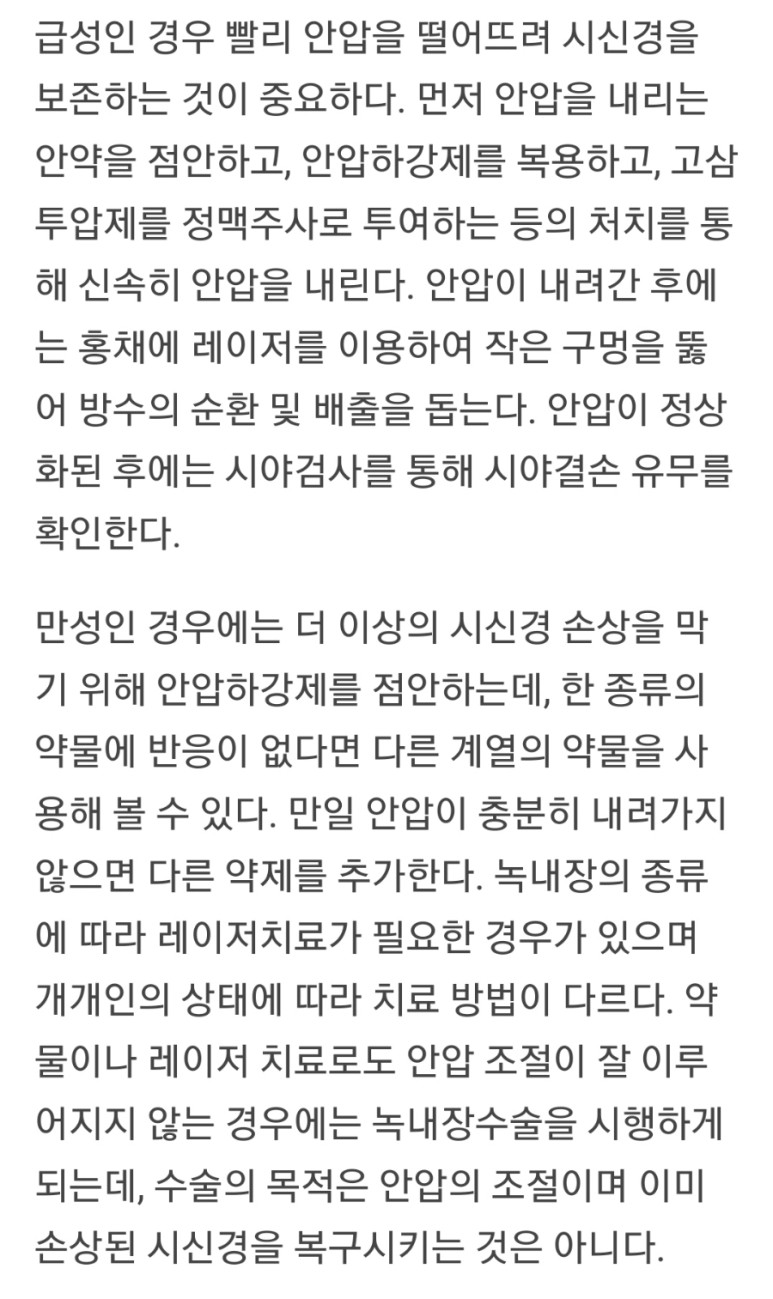 그러나 안압은 점차 증가하기 때문에 발견이 쉽지 않습니다.