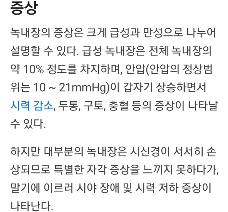 녹내장의 증상으로 1) 임점이나 월군을 볼 수 있는 2) 눈의 충혈과 통증 3) 시야가 좁아짐 4) 두통과 구토 증세 5 ) 갑작스런 안정 피로, 시력 저하
