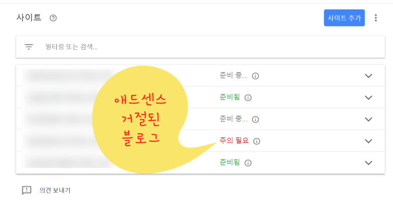 Ace는 2개의 어드센스 승인 블로그가 있고 3개의 어드센스 승인 요청 블로그가 있습니다. 그 중 2개는 어드센스 검토 중, 다른 1개는 오늘 승인 거절된 블로그입니다. 승인 거절된 블로그는 아래와 같이 빨간색으로 주의할 필요라고 표시됩니다. 녹색준비완료문자는어드센스가승인된블로그입니다. 보시다시피 여러 블로그에 어드센스를 신청하면 수익을 찾을 수 있습니다.