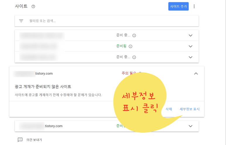 어드센스 거절된 사이트는 <주의 필요>로 표시되는 빨간색 주의 필요를 클릭하면 아래와 같이 광고 게재가 준비되지 않은 사이트라는 문구와 상세정보 표시라는 단어가 표시됩니다. 상세정보 표시를 누릅니다.