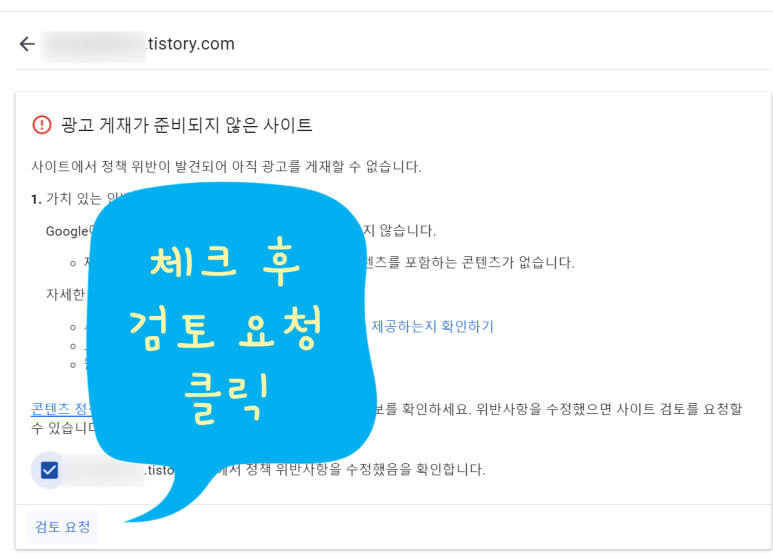 상세정보 표시 클릭 정책 위반이 발생했다는 내용이 있는데, 별로 중요하지 않아 아래 체크박스를 체크한 후 검토 요청을 클릭합니다.