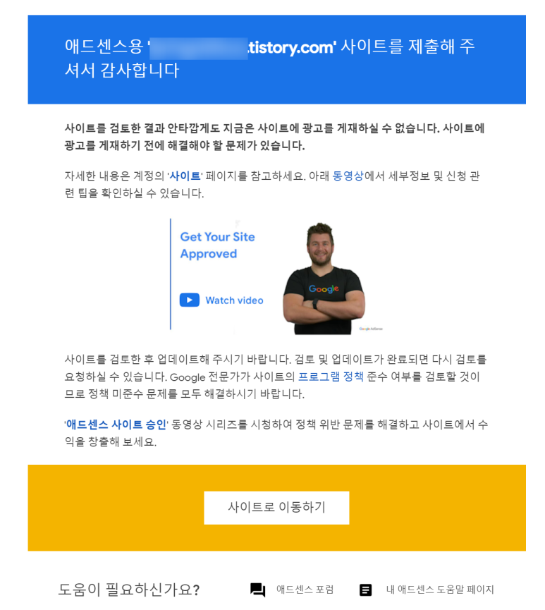 아까 보았던 Google Adsensing 수정 요청 메일 하단의 「사이트로 이동하기」를 클릭합니다.