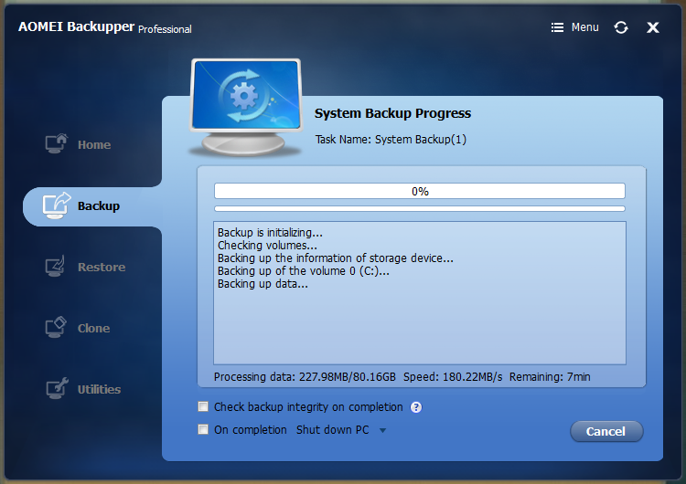 하단의 check box에 on comp letion – Shut down PC를 선택하여 체크박스를 체크하면 백업 완료 후 컴퓨터를 끕니다.