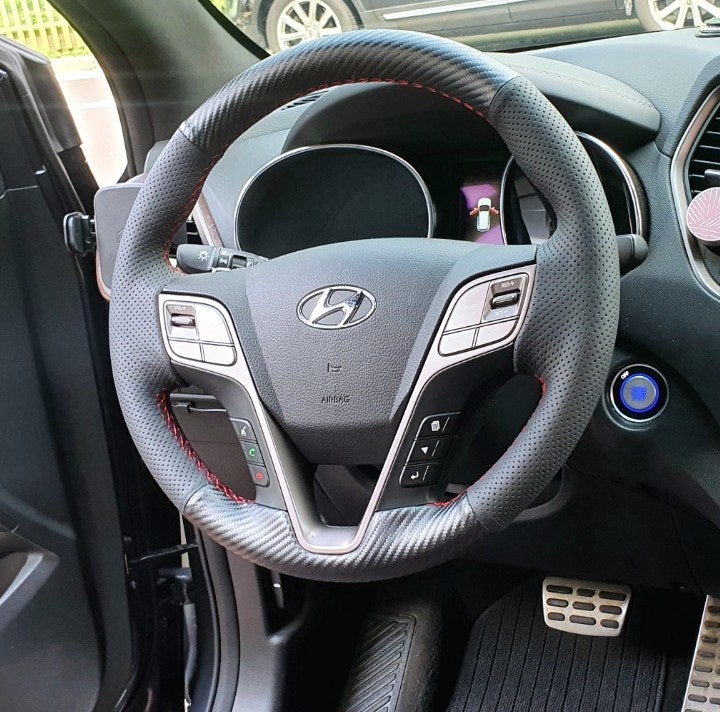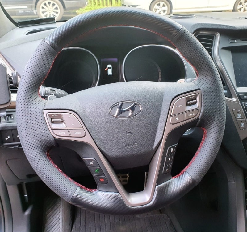 싼타페 dm이 선택한 핸들커버는.. 좌우: 타공가죽(천연소가죽) 상하: 무광카본 실색: 붉은색입니다. 유니크하면 유니크하죠~ 보통 suv의 경우 스포티함보다 고급스러움을 추구하지만 이번 싼타페의 경우 무광 카본을 넣어 스포티함까지 생각했습니다. 손이 닿는 핸들 좌우 라인에는 천연 소가죽 타공을 넣어 그립감을 높였습니다. 손에 땀흘려도 미끄러지지 않아요~ #싼타페dm핸들커버 #싼타페핸들커버