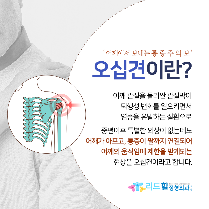 우리 몸은 세월이 지남에 따라 기능이 노화되고 다양한 통증을 일으킵니다.그 중에서도 오십견은 일상생활에서 많은 제약을 받는 질환의 하나로 팔을 올리기 어렵거나 물건을 들고 옷을 입는 등의 간단한 동작도 힘듭니다.