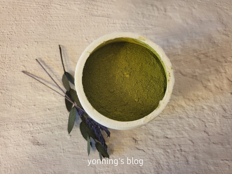 이렇게 사진을 찍으면 마치 녹차 가루 같기도 하고 녹차 가루 같기도 한 모링가분말 가루 제가 손으로 만져보니 폭신폭신하고 기분이 좋아요. 굉장히 예쁜 분말가루예요.