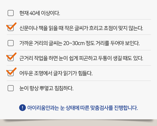• 원시성 노안: 근거리와 원거리 모두 잘 보이지 않는 증상