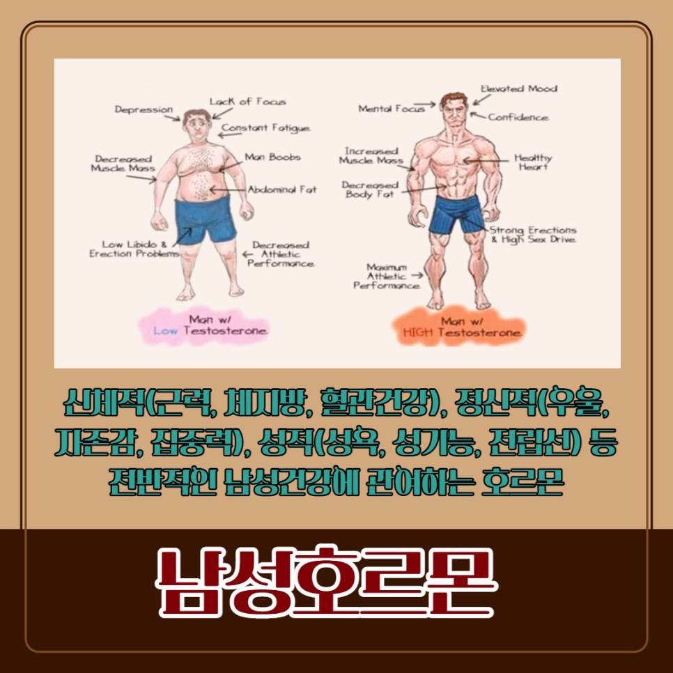 남성에게 남성호르몬은 성기능 외에도 신체적(근력, 체지방, 혈관건강), 정신적(우울, 자존감, 집중력), 성적(성욕, 성기능, 전립선) 등 전반적인 남성건강에 매우 중요한 영향을 미치는 호르몬이었습니다.