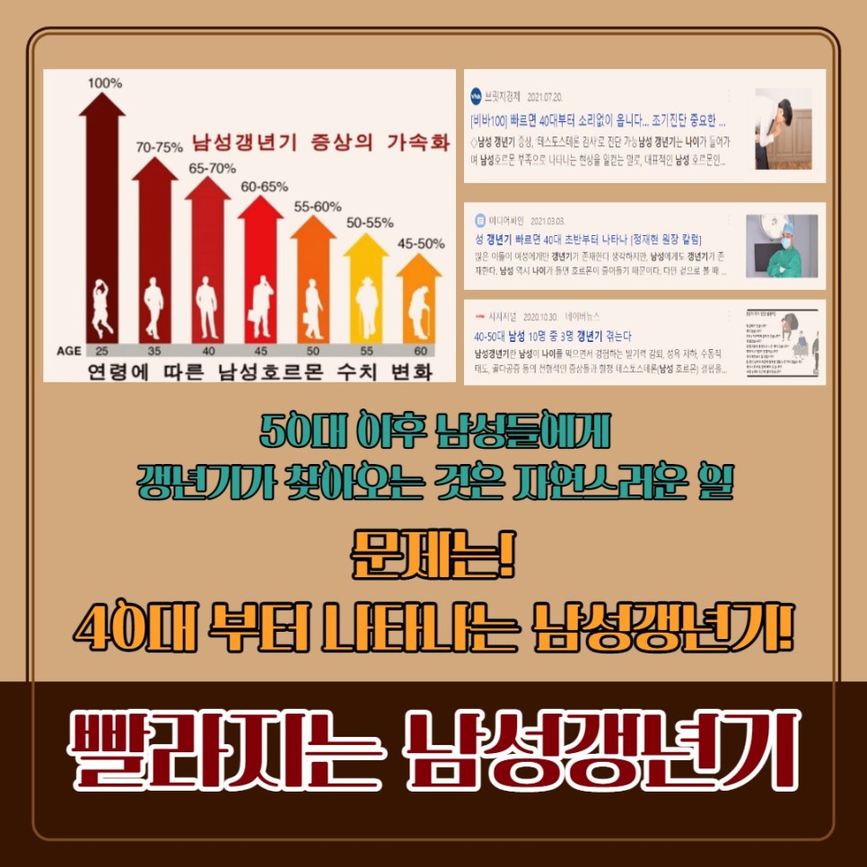 노화로 인한 남성호르몬의 감소는 매우 자연스러운 것으로 50대 이후 남성에게 갱년기가 찾아오는 것도 남성호르몬의 감소로 인한 증상으로 사춘기처럼 슬기롭게 극복해 나가면 되는데 문제는 남성호르몬의 급격한 감소로 50대 이후에 나타나는 갱년기가 40대에서 발현되고 이로 인해 남성의 남성건강문제가 빠르게 나타난다는 것입니다.